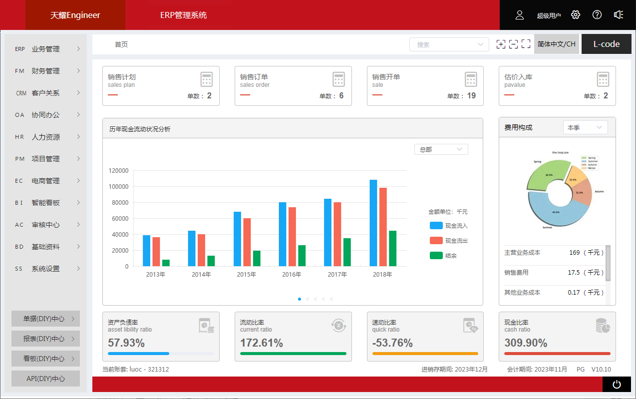 天耀AI-5.engineer PRO《ERP管理系统》 是一套完整的企业资源计划信息解决方案。有机的将进销存管理(PSI)、生产管理(PMC)、财务管理(FIN)、协同办公(OA)、客户关系管理(CRM)、人力资源管理(HR)、项目管理(PM)、电商管理(EC)、智能看板(BI)集成为一体,数据共享、穿透、汇总。
