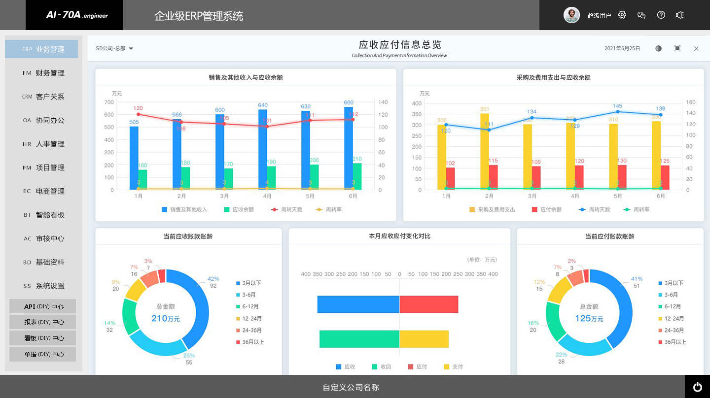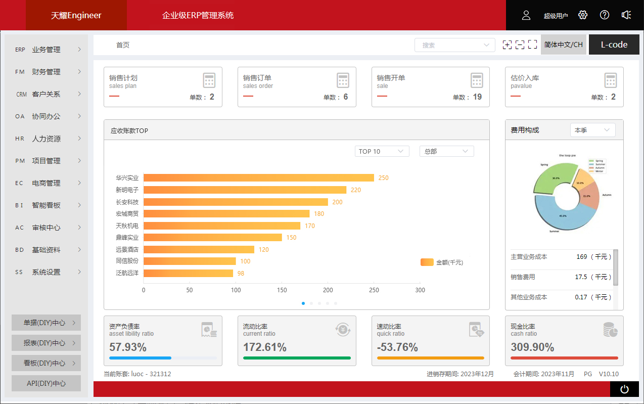天耀AI-70.engineer XP《企业级ERP系统》 是一套完整的企业资源计划信息解决方案。有机的将进销存管理(PSI)、生产管理( PMC)、财务管理(FIN)、协同办公(OA)、客户关系管理(CRM)、人力资源管理(HR)、项目管理(PM)、电商管理(EC)、智能看板( BI )集成为一体,数据共享、穿透、汇总。